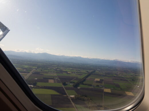 13:40発 JAL572便に搭乗。眼下に十勝の農村風景を眺めながら・・