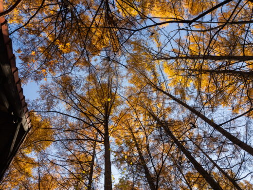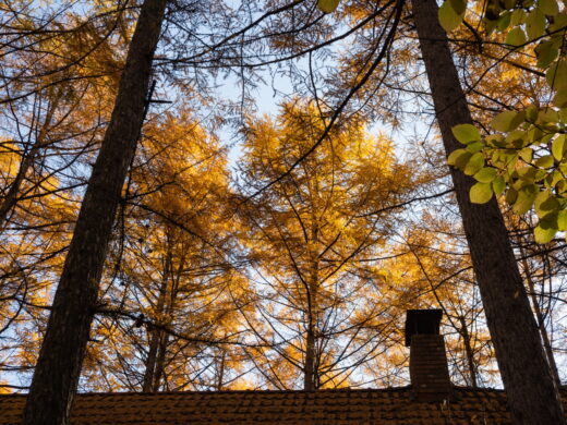 建物の上を見上げると、黄金色のカラマツ。