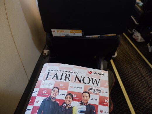 この便はエンブラエルE190で運行。羽田でJ-AIRのエンブラエルに乗るのは初めてです。