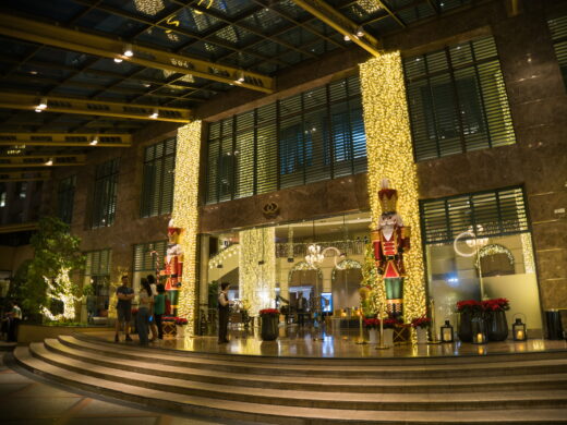 最上階のラウンジでアルコールと軽食をいただいてから、街中に散歩へ出掛けます。