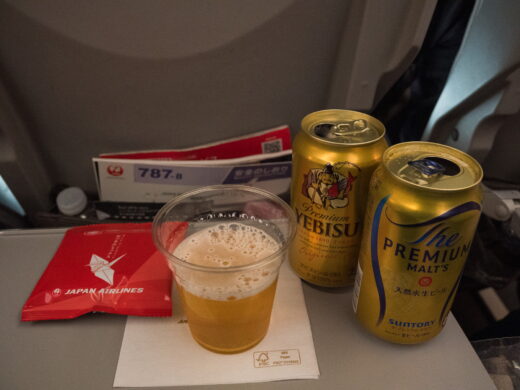 機内ではCAさんがエビスと間違えてプレミアモルツを開けてしまったので、両方いただきました。